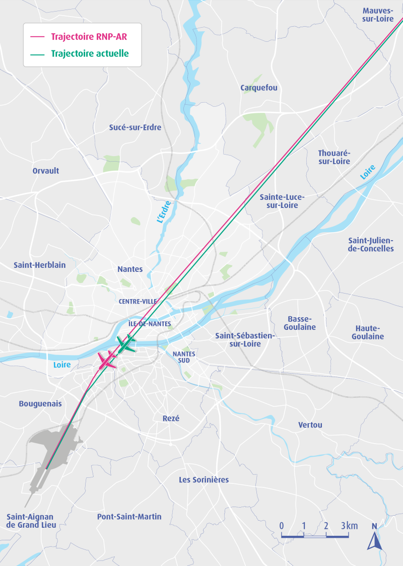 Aujourd’hui à l’aéroport de Nantes-Atlantique, les avions empruntent une trajectoire spécifique pour les atterrissages par le nord. Les approches sont désaxées de 12° par rapport à l’axe de la piste pour éviter le survol du cœur d’agglomération et réduire les nuisances sonores. Les avions se remettent dans l’axe de la piste juste avant d’atterrir.